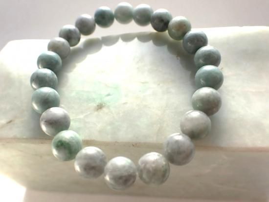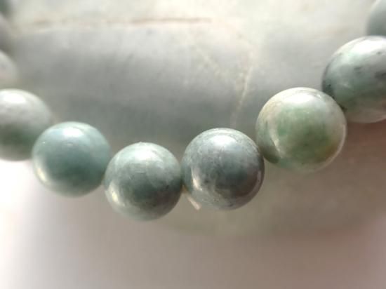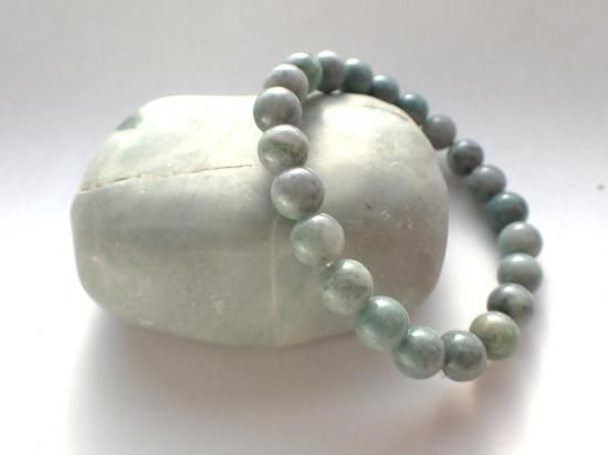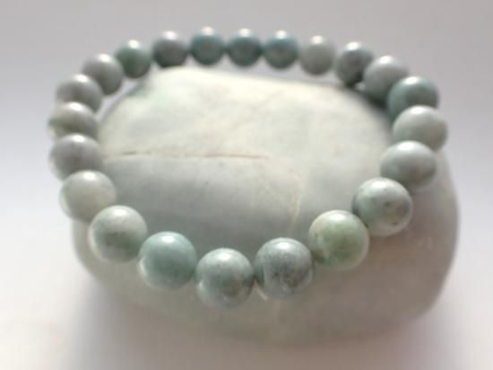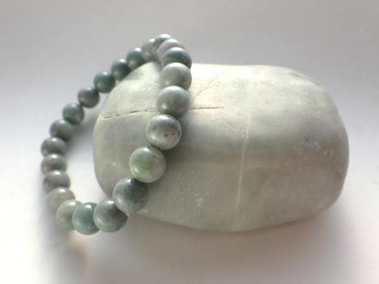 サイズ:約8mm玉、内径(手首回り)約16cm。明るい灰色に青緑色が混ざっています。樹脂浸透していない、未染色の新潟県糸魚川市産翡翠原石(糸魚川ヒスイ)を使用しています。オペロンゴム結び。コロナウイルス騒動以前に香港の特約工場で製作したため、安価に提供できています。