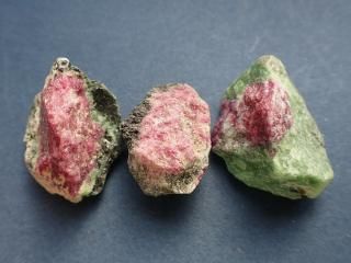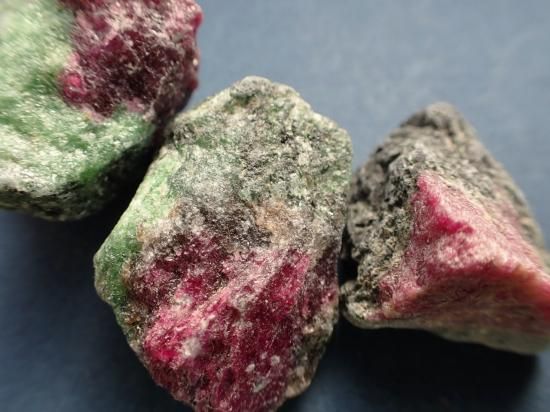 サイズ:約24-30mm、タンザニア産。3個を一組にしてお送りします。サムネールボックス用にコレクションしてきた原石をクリアランスセールのため卸価格で提供しています。ゾイサイトの母岩にルビー結晶が包まれています。緑色と濃赤色(小豆色)との対比が美しい標本です。エピドート(緑簾石)グループに属する鉱物で国産でピンク色したものはピンクヒスイの愛称で親しまれています。ゾイサイトの透明藍色結晶で宝石質のものがタンザナイトです。ルビーゾイサイトには「気」をおちつけながらも熱意を持続させる効力があります。