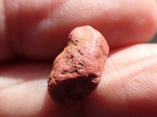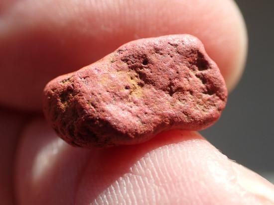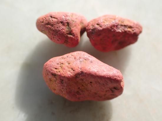 サイズ:約12-9mm、4.0g。芋辰砂は鉱床の母岩が地下水に溶けて流され、辰砂微結晶のみが集積してできたと考えられています。結晶が発達したものではなく、微結晶の凝集体です。形状から芋辰砂と呼ばれてきました。北海道北見市留辺蘂町(るべしべちょう)イトムカ鉱山のものがよく知られています。背景の転石は製品に付属していません。3個一組にしてお送りします。